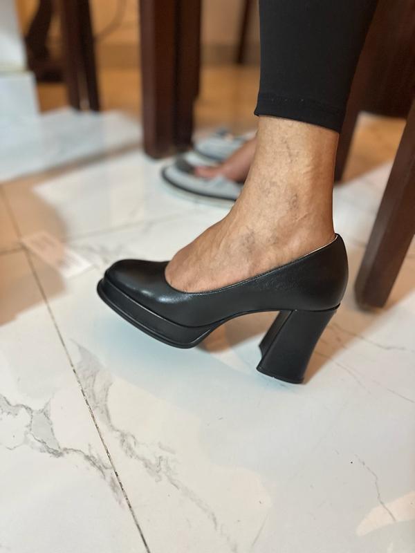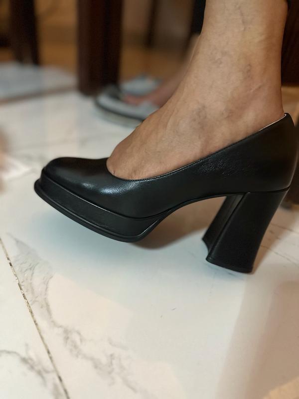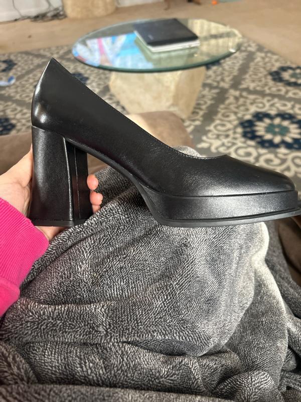 These heels are super chunky and pretty which I like. I think they make the top of my foot look a little weird without socks so I ought wear these with tights or something but they are nicely shaped to my foot wide square toe style but covered and leather with a cute pendant in the back to match the brand. These would go well with most outsides and are very high quality would recommend. Perfect for a more gothy style look if you style them up. I love the fat chunky heel and texture. Snug fit no loose feeling around foot given there’s no strap