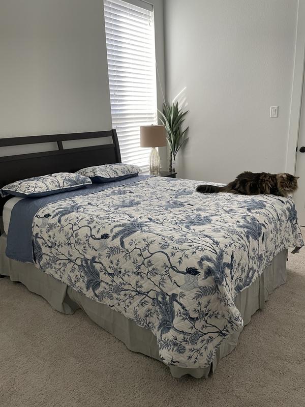 The pattern on this is nice, very tropical and fun for a guest room. The fabric is alright, not the softest, but fine if you sleep under a top sheet. Subtracted one star for softness and one because it’s not low maintenance with pets. I washed it once and it clung to every piece of pet hair in the dryer even though I use dryer sheets and wool dryer balls. I ended up having to use a fur remover to make it presentable in our guest room which is more maintenance than I prefer.