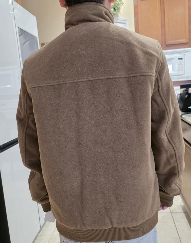 What a fabulous Jacket! This Cole Haan Mens Stand Collar Bomber Jacket is really top of the line. The wool outer shell and inner lining make it so warm and comfortable. The knit cuffs keep any air from sneaking in along with the knit waistband. The zipper is heavy duty and zips smoothly without catching. There are snaps over the zipper to make a smooth tailored look. If you want the Collar to stand up just button the 2 buttons. This jacket will look great for any occasion.
