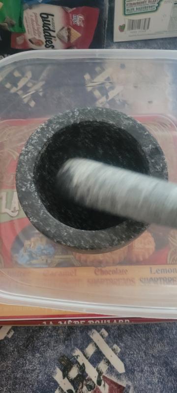 I love this mortar and pestle set . It looks great on my kitchen counter. Also very convenient to use as perfectly size and built. I had a small one but this one seems perfect to use . Also I purchased on sale , very good value!