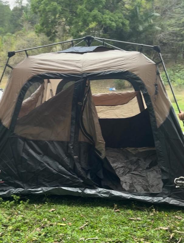 We used this camping as a family of 4. It was such a great size for us and had plenty of room. It was a bit windy where were and the tent held up quite well, although there was a bit of moisture that came through. I feel the pit shell needs to be a bit more durable. All in all it was good for our short trip away.