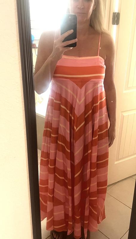 First of all, I LOVE this dress !! I’m 5’11 and heavier than normal — got a large and it’s perfect ! (Thanks to elastic in the back ). It’s slimming and can be dressed up or down — I’m wearing it to my niece’s wedding . My sister loved it so much , she ordered a P & P dress for the wedding also ! Ignore the fact I’m braless and in house shoes — love this dress and how it makes me look and feel— it’s a happy dress !! I took one star off because the stripes don’t line up and that’s front and center of the dress . The way it hangs it doesn’t really show but I was shocked it was off in such prominent spot on dress .