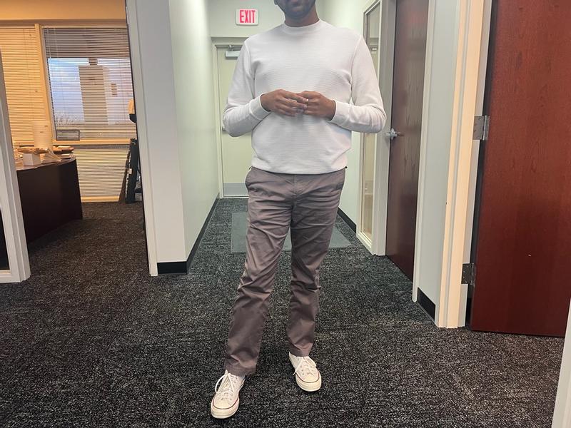 The fit is perfect and true to size, and the stretch waistband makes them really comfortable. The color and feel of the fabric are both solid. They have a standard straight-leg cut that actually looks like a true straight leg that’s neither too baggy or too tight. Overall, just a reliable, comfortable pair of pants that work well for everyday wear.