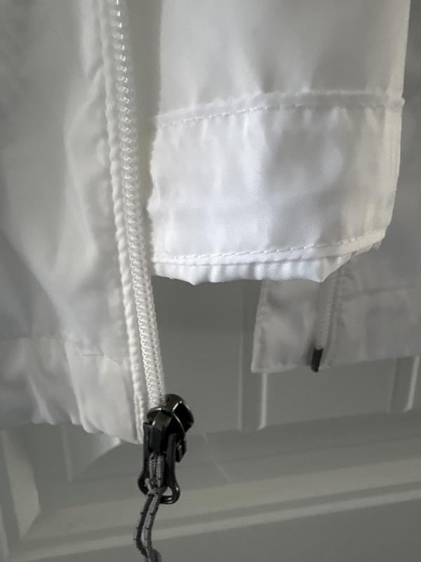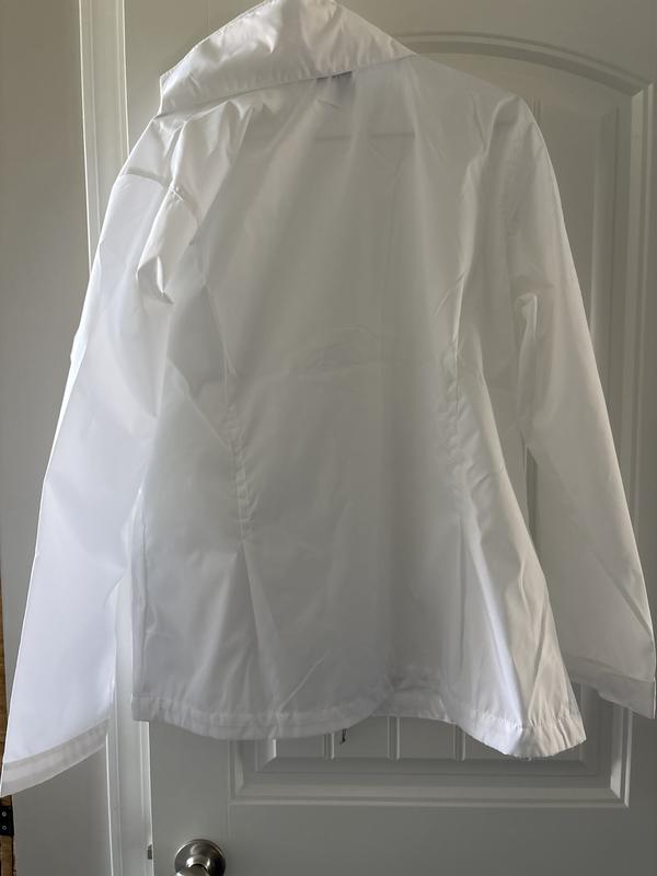 This jacket is just off. It runs small and is very see through. This jacket does not look good at all if you are wearing dark clothing because you see the dark clothing right through the white material. So basically it’s only a white jacket if you are shearing white clothing underneath the jacket. This jacket is not representative of the Columbia brand.