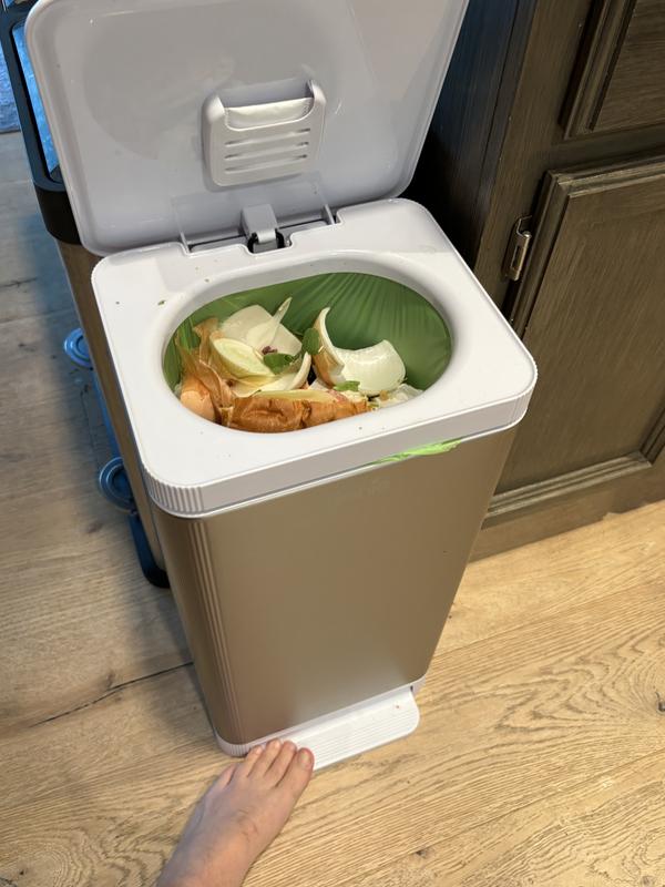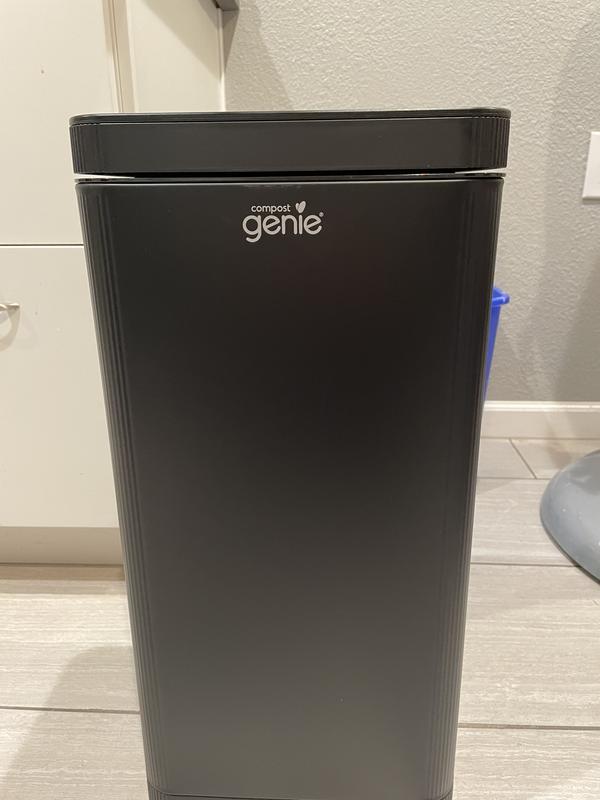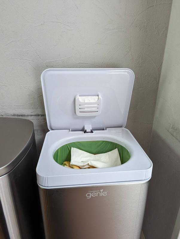 We have been searching for a functional yet elegant solution to our compost waste disposal issue and we have found it in the Compost Genie. The White color looks gorgeous. The product is very simple to put together and use. There is no smell at all, and we have been filling this up to the top twice a week. The compostable bags are very strong. The feature that the next bag to use pulls up automatically when you are ready to dispose the current bag is very smart.