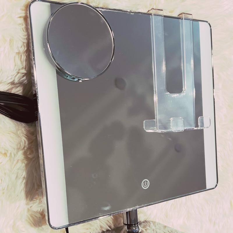 This mirror is remarkable!! I fell in love immediately, the mirror has built in lighting which has a couple different brightness settings which is amazing. it comes with a magnifying mirror that is magnetic to the mirror itself, SO CONVENIENT. The mirror also comes with a phone holder to attached to the mirror itself. They really thought of everything when designing this mirror!!!!