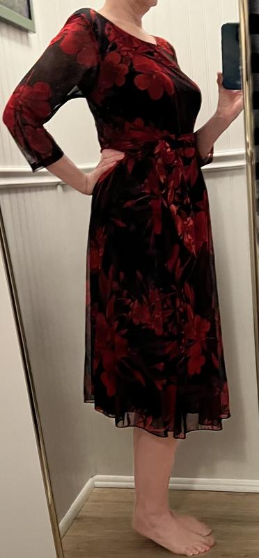 This dress is ultra comfortable and feels dressy. I am 66 yrs old, so it's a fun dress that would be age appropriate for much younger women - but it doesn't make me look like I'm trying to be 30 again either. I would say it runs a bit large. I tend to be a Medium to Large in tops in bust and waist, but Large through the hips. I stressed about what size to order based on the Size Guide vs. Reviews, but listened to the reviews. The size 10 is exactly perfect. I am 5'7" and weigh 158 lbs and have a high waist (35) - am not busty (38A) - and have hips (44). The stretchy material helps the top fit perfectly with the A line structure giving me a nice waistline while the added swing in the crepe skirt gives the dress nice flowy balance. The scoop of the neck is a bit deeper on me than on the model. I'm tall so the dress hits nicely below my knees. There is a bit of deep purple in the floral design that I did not detect when viewing online but I love it. It gives the dress added dimension.