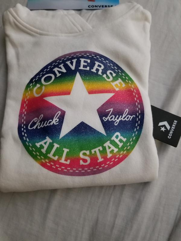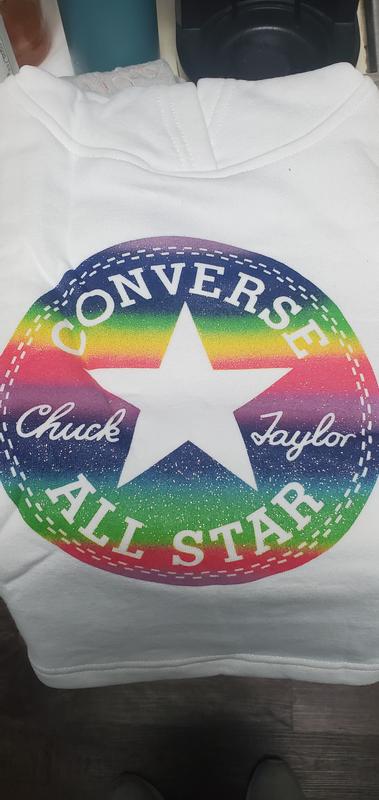 My daughter absolutely loves this hoodie from converse!! I love the bright, vibrant rainbow colors of the decal, and the overall fit of it. I would definitely recommend this hoodie and this brand to anyone that has young daughters. It is easy to wash also.