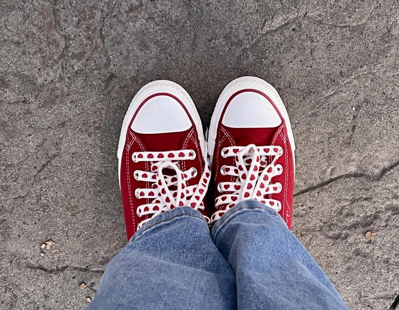 These are such great sneakers! I love all the detail from the embroidered word “love,” the charm, the extra laces with hearts, and the heart soles. And they’re comfy. Well done Converse!