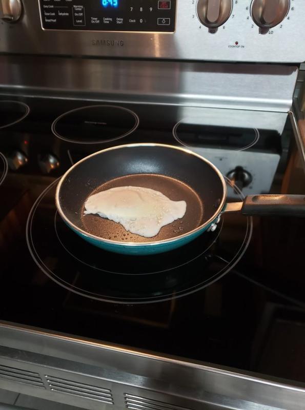 I have had these pans for about 2 weeks now and I am in love. Straight out of the box you notice the beautiful teal blue color. They are different from other pans that I have and I really like the color. Their felt pretty sturdy and a good weight, and it was nice to have the set come with three different sizes. I have used them several times and they heat up quickly and evenly. I have used them to make eggs and have been successful every time. I did use a little butter in the pan and had no issue with the eggs sticking. Clean up was breeze with a quick wipe of a sponge and a rinse. I have also tried making sausage and again great even heating and no sticking. These pans have become my new favorites!
