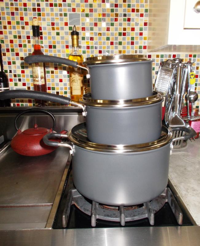 This is a great pot and pan set. The spoon and spatula that come with it have a riser on the bottom so you don't have to worry about setting them down and getting dirty, they stay about a inch above where you set them down. The pans are great as well for frying up burgers, eggs, etc and the best part is that what you are cooking does not stick to the pan. I made pasta in the bigger pot, in my opinion the best part of this was the clean up. Nothing stuck to the sides, no pasta sauce caked on, was able to quickly wipe the pot clean. They are easy to clean up so no need to put them in your dishwasher. They can be cleaned out within minuets by hand. Now on to the lids, I like the grips that make it easier to hold when draining and don't burn your hands, but what I don't like is how high they are up, it takes a quite bit of storage if you leave them straight up, my solution was to turn the lids upside down so the handle is in the pot and taking up less storage space. On the other hand if you have a hanging storage system for your pots and pans this is perfect for that. I think this would make a great, house warming, wedding, birthday, Christmas, etc present.