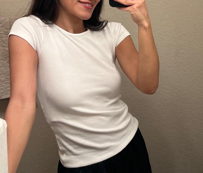 Useful smart ribbed Tshirt. Bought for daughter to wear with some outfits as a young primary school teacher. What was handy was it was long as so many of her T-shirts are shorter. This meant no midriff showing and good for under other clothes eg a sleeveless dress. Got the small/10 whereas she is normally a 6-8 but didnāt want it too clingy.