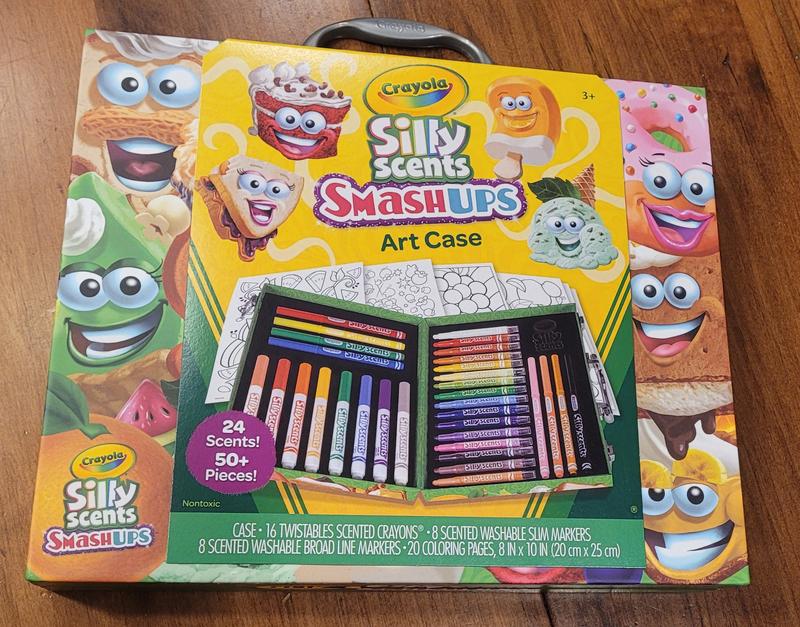 These Silly Scents Smash Up Minis in the Art Case are FANTASTIC! First of all, my kids were so excited when they came that they literally gathered around to open and begin smelling them (see photo)! My kids range in age from almost 4 to 11, so at this time there aren’t really a ton of things they all get excited about the same time. My oldest two loved reading the names of the scents and the kids then smelled each one. They thought the names were so silly and funny. These products do Crayola justice! I’ve tried some other brands of scented markers, crayons, and pencils and had them 1. Smell like nothing at all or 2. Be so sickeningly overpowering that it actually induces a headache. These are the sweet spot- just right. They color just as good as the washable markers but they are a little harder to wash off than the standard Crayola washable ones which, at least on my kids, pretty much come off with a splash of water. I will say they come off of walls and floors just as easily as the washable ones (thank God for those magic eraser sponges). The case is clutch! We lose things a lot around this house. We’ve already taken them on the road to occupy my preschooler in the car pickup line while we waited for the big kids. They’ve also come in handy while we’ve waited in restaurants. By some miracle, we’ve had them a week and haven’t lost any (we keep saying: “put them back in their home when you’re done.” Their home is the little spot in the case haha). Another fun fact: my daughter noticed that if you rub the color with your finger on the page (after you’ve colored), the smell re-emerges, almost like a scratch and sniff sticker effect. Pretty cool! I have enjoyed Crayola products since I was a little kid, so it’s pretty neat my kids can continue the tradition!