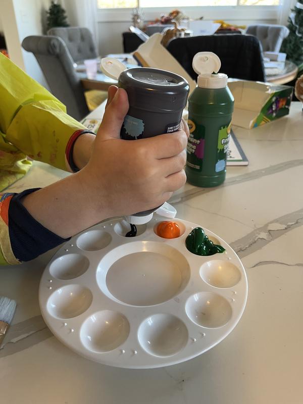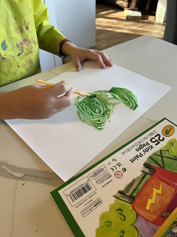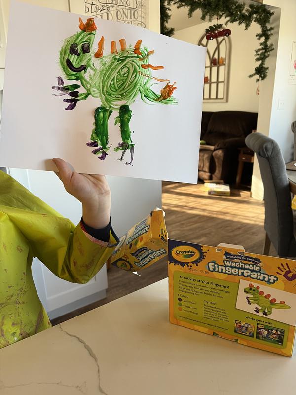 This is a review for the washable paint colors: orange, green, and purple. All paint was fingerprint and easy to wash away from counter tops and clothing. It was used in conjunction with the Kid’s Paint Pad which had very thick pages. I liked that the paint didn’t seep through. The paper was very durable and the paint colors were nice and bright.