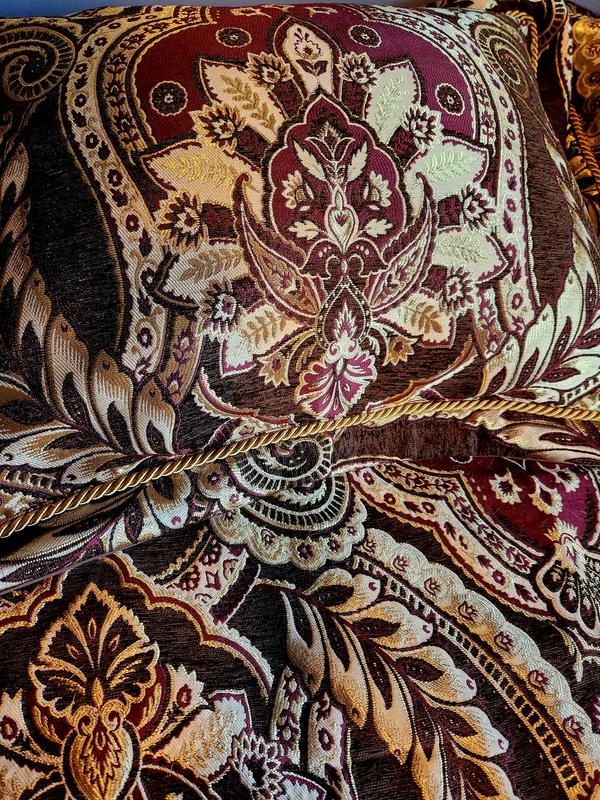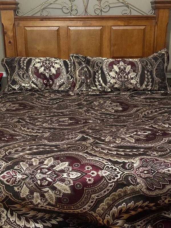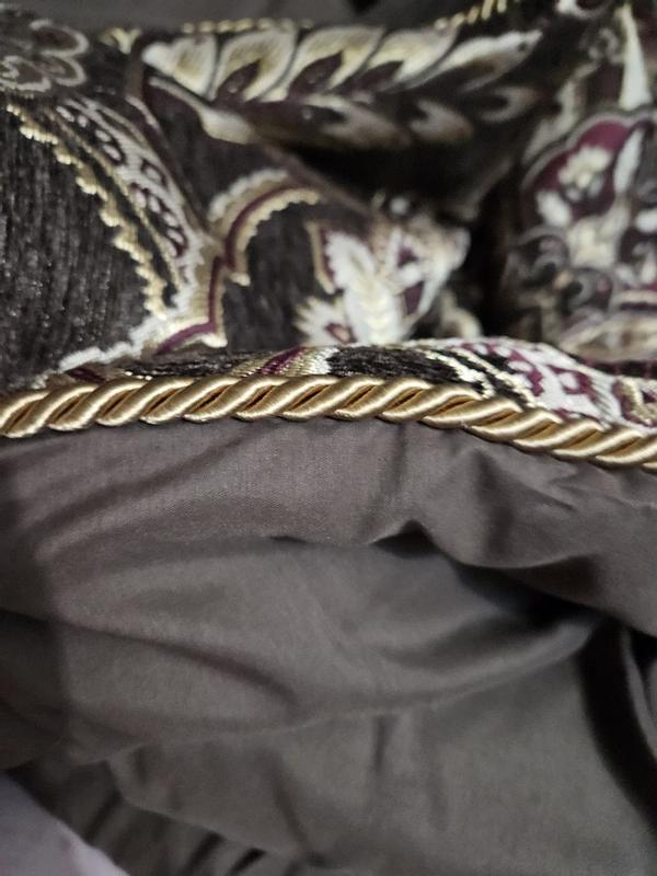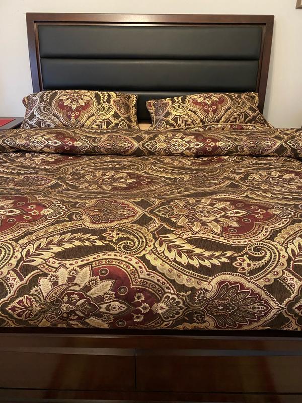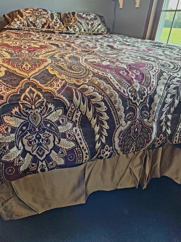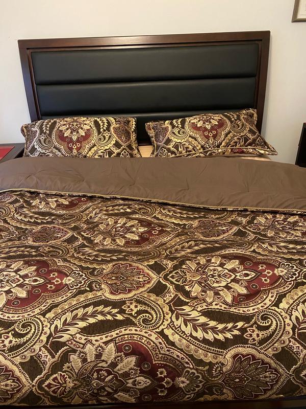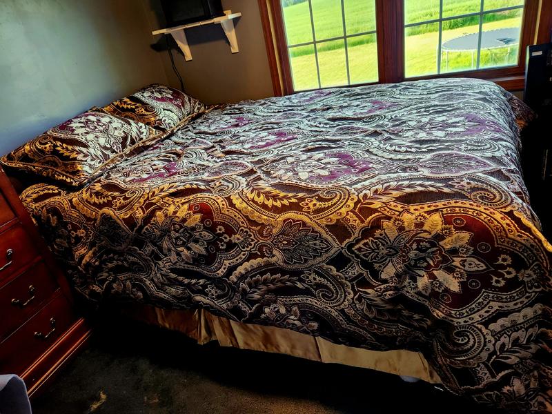 very pleased with this set. It is super thick and feels rich and heavy. Texture feels like quality and everything looks over the top special. The item is very warm and gives a nice dressed look to the bed. It has browns, golds, and burgundy in it so matching curtains and pillows should be fun. Feels like it should last for years and years.