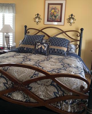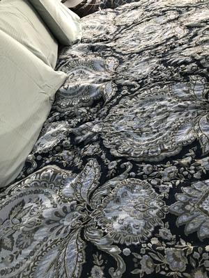I purchased this lovely bedding set back in late December of 2019. I must say it looks amazing on our King bed and with a cat that likes to jump up on the new comforter all the time, it has held up beautifully! I purchased the bed set, curtains, valance, pillows, etc. the whole kit and caboodle and it really makes our bedroom look very regal. I love it! This set was very easy to match up with our lighly painted grey walls because the comforter has light blues, tan, dark navy, silver, bits of bright yellow (some say a gold-ish tone) so it's very versatile with most home fashions. This is a HUGE hit with me and friends & family!