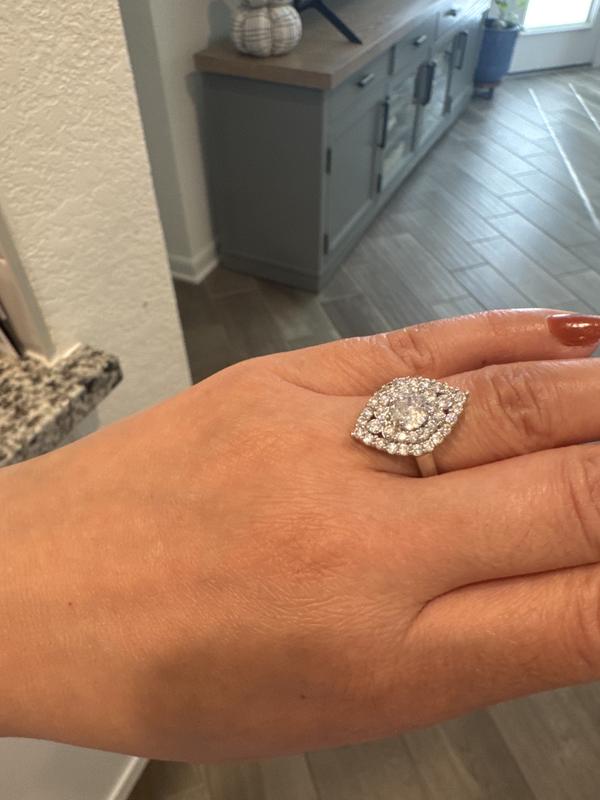 Cubic Zirconia 2 Row Kite Halo with Round Prong Center Stone Ring in Silver Plate