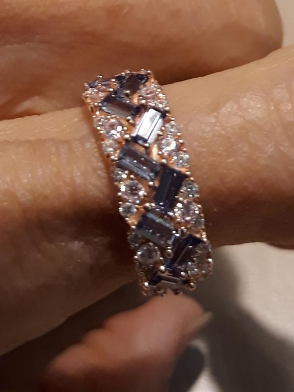 I bought the rose gold version as an accent ring to wear at my wedding (as my "something blue") because my fiance and I got engaged in Tanzania and I worried that a real tanzanite ring would be too soft and risk damage. Fit is accurate and I've gotten so many compliments on it. It photographs really well. I'm leaving four stars instead of five because two tiny stones fell out almost immediately (one at either end of the ring). The missing stones are not noticeable to the casual admirer... I purchased this ring on deep discount so I'd say for the price, it's a great buy!