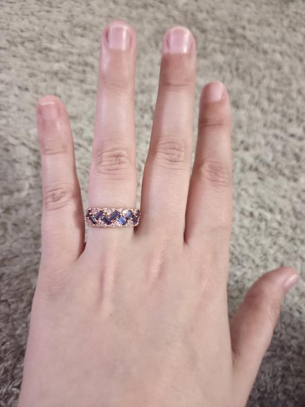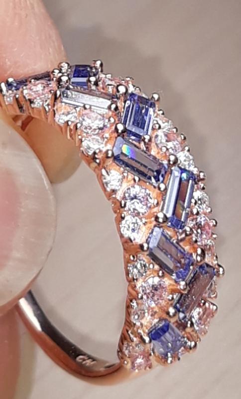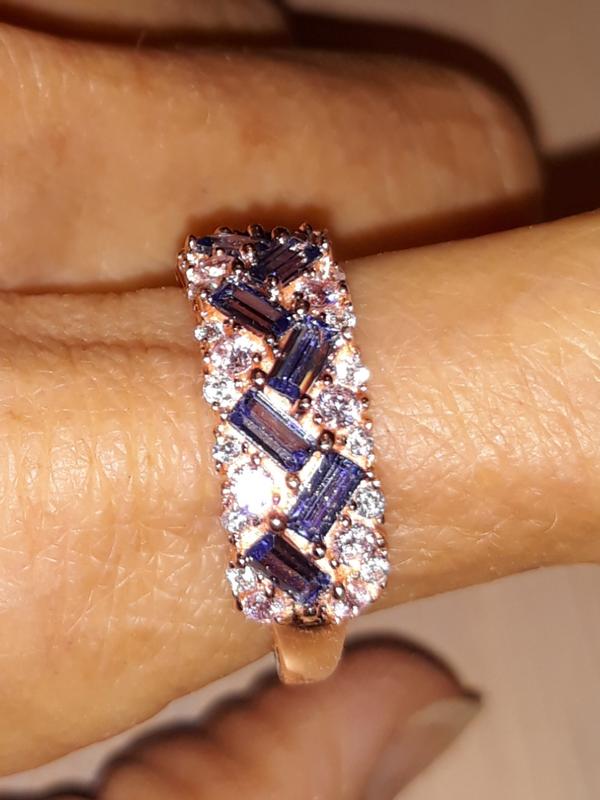 The ring is pretty but looks nothing like the online photo. I thought the ring would be a mix of lavender and pink, which is what I was looking for. But the main stones are a dark blue and you can barely tell that the smaller stones are pink. Disappointing that the image of the ring was so inaccurate.