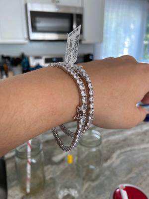 I would give this bracelet 5 stars for looks —it is a beautiful classic tennis bracelet with an S link and the stones look like real diamonds— EXCEPT that straight out of the box, one side of the clasp was loose and came off and the metal of the bracelet turned my skin green after only a few hours of wearing! So I bought a second one thinking that it was a fluke and it too turned my skin green and one side of the clasp was also loose and did not stay fastened. Do not waste your money.
