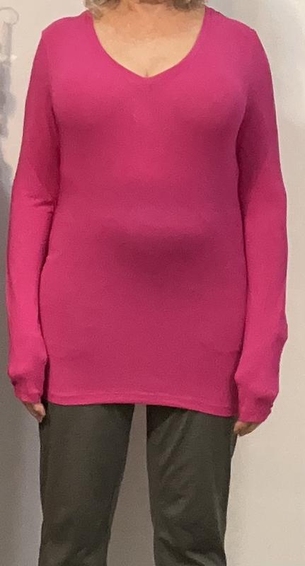 I love this top. It’s close fitting with plenty of stretch. The neckline is perfect for jewel neck sweaters.