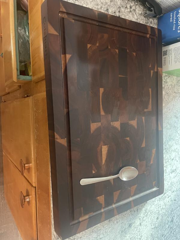 Saw this on sale and had been looking for a good cutting board. This one surpasses all the other cutting boards and has awesome features like the cut in reservoir to collect any juices so they’re not running all over the counter. Also cut ins on sides so can lift it easily. The wood design overall looks rich and expensive and with the cuisinart logo on the side you know you are getting a quality item. Fantastic price in comparison to others offered. I like the size of this and also doubles as a perfect charcuterie board.