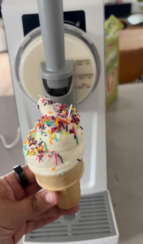 Bought this as an Xmas gift for family. After making ice cream 3 times, following the recipes in the book and some slight modifications, consensus is "Ice Cream" is more milk shake consistency than "Soft Serve". Flavors are great, it's not icy, but it's rather soupy. Half hour to an hour in the freezer hits the right texture. Also have made Frappes, which turned out fantastic and if anything, a touch too thick.