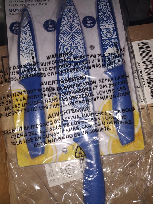• Set includes: 8" chef's knife and blade guard, 5.5" serrated utility knife and blade guard, 3.5" paring knife and blade guard