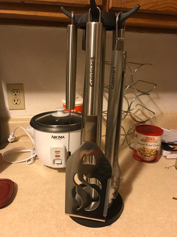 The Cuisinart Carousel 10 Piece Grill Tool Se set is good quality; however, the carousel the tools hang on broke after about six months. It was also too tall to sit on top of my counter.