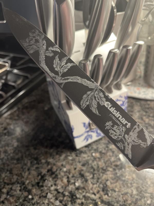 Beautiful knife set. The block and the engraving on the knives are so pretty. But don’t let that fool you. The knives are also sharp !