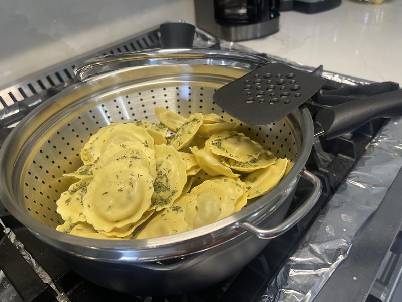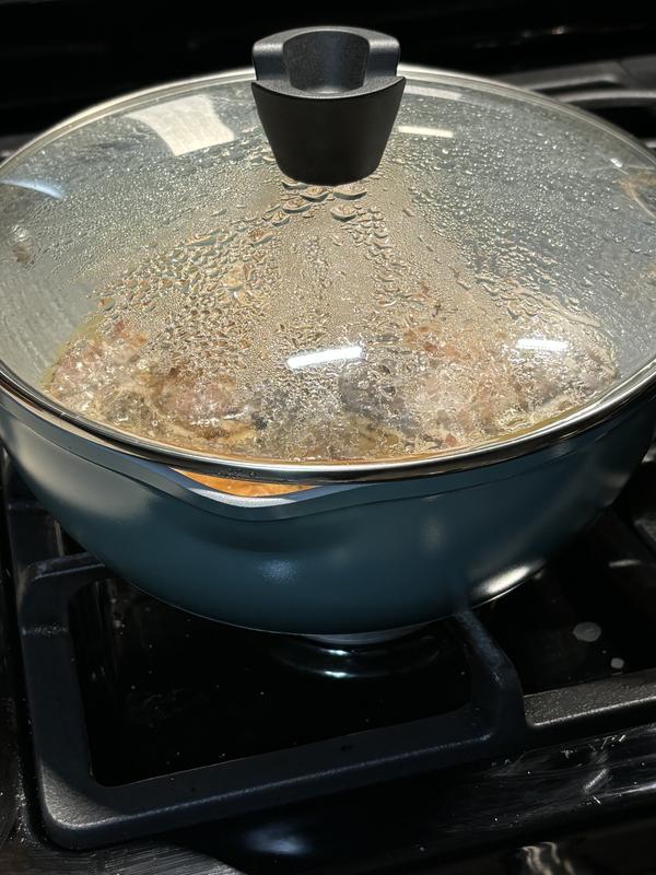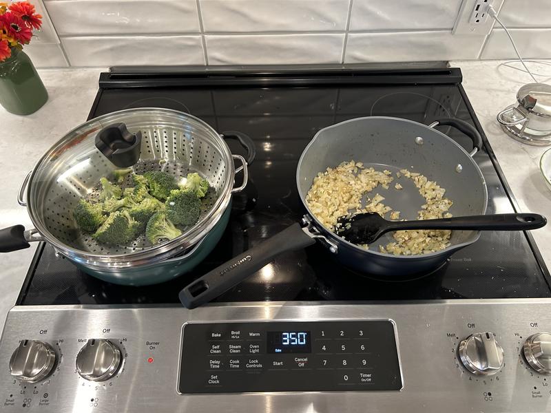 I love this 4 pc Cuisinart Ceramic Nonstick Pan. I have already used it to prepare two one-pot meals with meat, vegetables, chunks of potatoes, etc. I made one dish with the steamer and one without. The food was perfectly cooked and the pan is easy to clean. Only comment is that it is much larger than I imagined. You need to read measurements if you want to purchase this, but it is totally hand or dishwasher and oven safe! Goodbye to my heavy crock pot!
