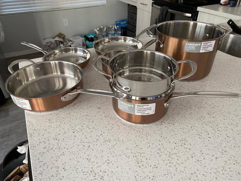 I love my new pots, they are beautiful and sturdy. I love that all the covers can be used on all the pots. I was a great bargain and know I will not be needing any new pots anytime soon. Love the copper look finish. Thanks Cuisinart.