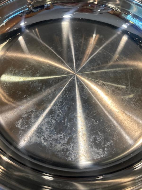 It’s a beautiful pan but after 2 uses it has white marks on it. I wrote to cuisinart and they advised washing it with distilled vinegar and water. I have many other stainless pans that don’t do this. I will give it a try and if it doesn’t work I will give it 1 star