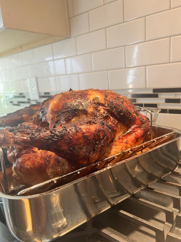 This roasting pan is perfect for the holidays. It’s high quality and the perfect size whether you have a 15 or 10 lb Turkey. It was easy to baste with it and easy to move around. I love it!