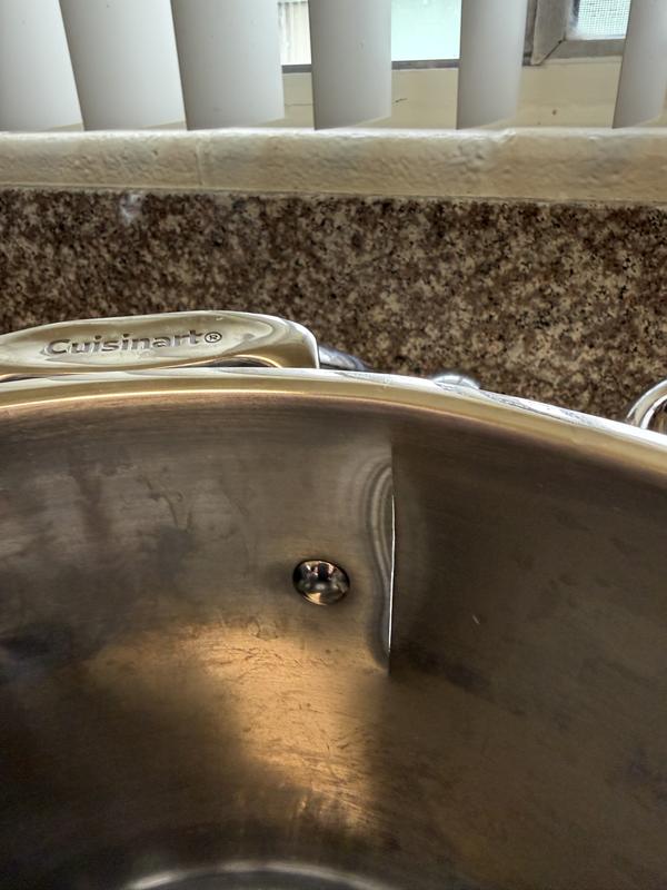 I bought this October 2 and this morning I am washing the stock pot and I couldn’t understand what I was looking at and then it dawned on me. I was seeing daylight all the way through the pot. I’ve used Cuisinart quite a long time so this is a new one on me.