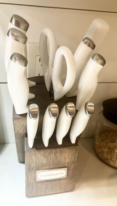 These are beautiful knives and so sharp. I love the white color and the knife block to keep things organized.