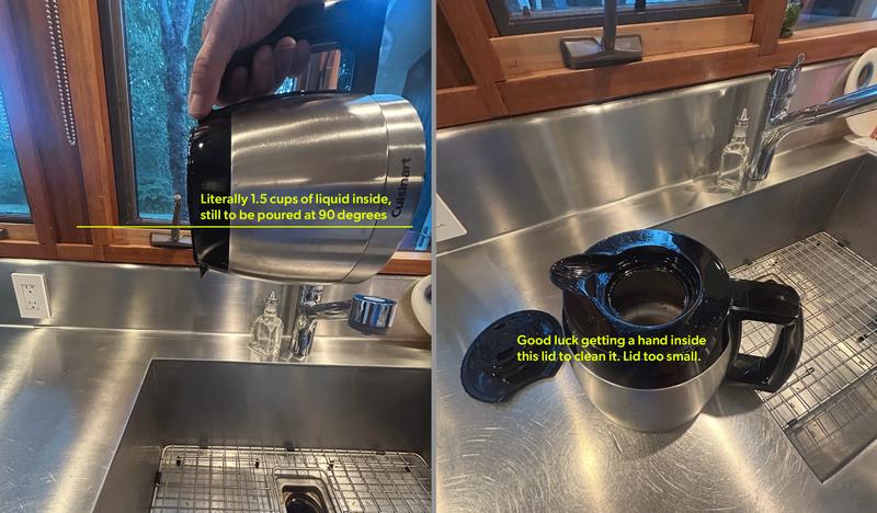 Impossible to get all water from pot to reservoir. Spills and makes a mess. Screwing lid on pot can be a pain. Older model was perfect. New redesign not so good.
