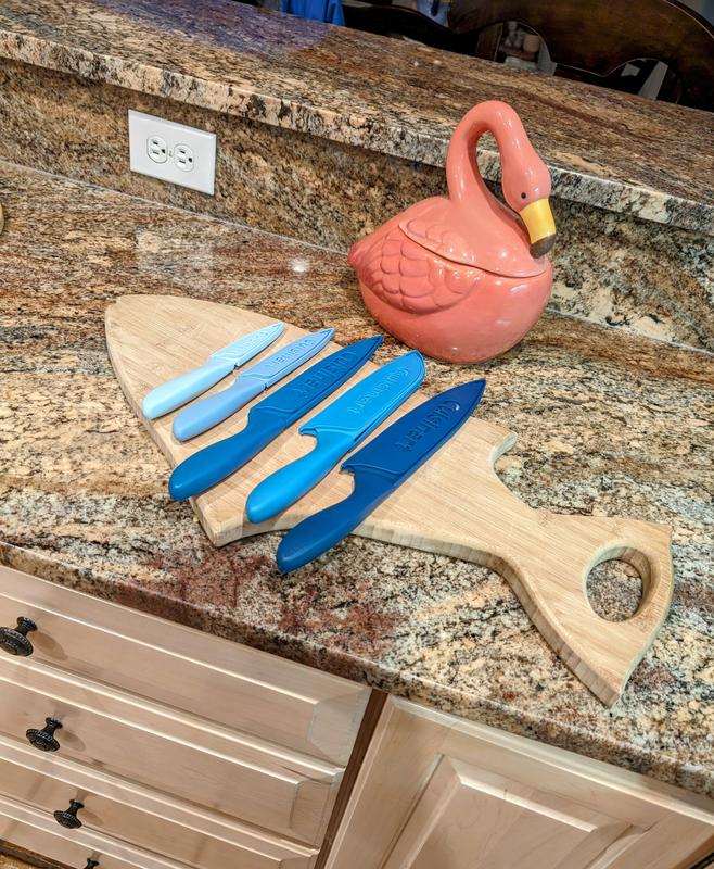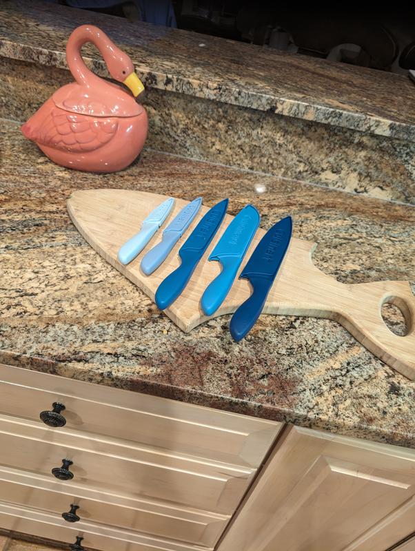 Designed in assorted shades of blue, this premium set of cutlery adds an on trend touch to any cutting task with distinctive styling and precision performance. Crafted with high quality ceramic coating for easy, non-stick slicing, each stainless steel blade is color coded to prevent cross contamination during food preparation. 5" serrated utility knife, 3.5" paring knife, 7" santoku, 8" slicing knife, 8" chef knife, each knife comes with a matching blade guard.