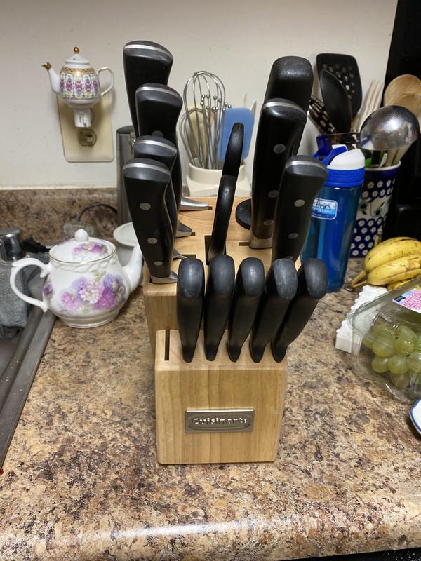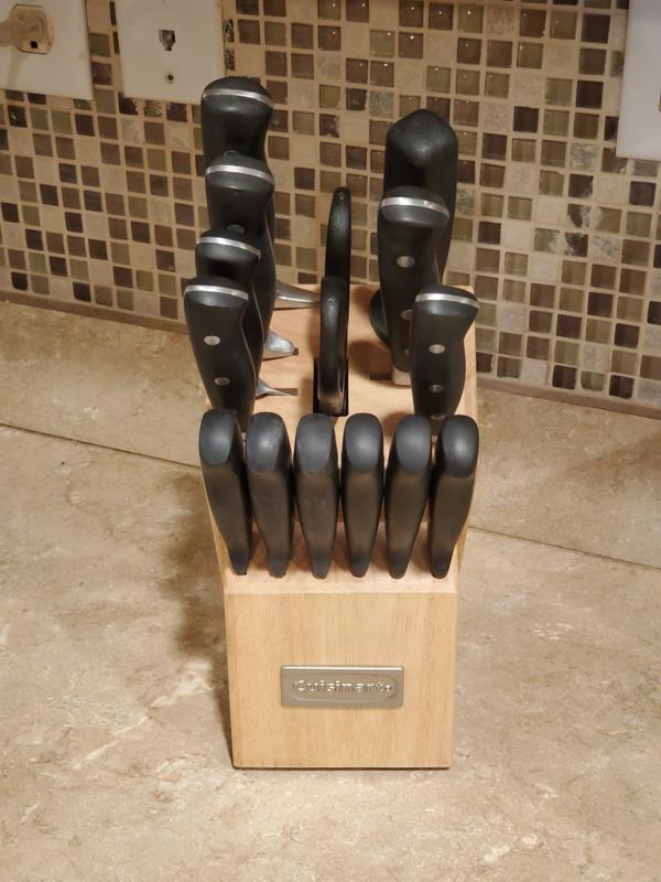 I have been looking for a knife set for a while and decided on Cuisinart based on their reputation. The wood block the knives are housed in is very sturdy and looks nice on my counter and the knives are very sturdy, a good grip on the handle, and very sharp. My husband also likes the scissors that are included, that is a must for him. Very good buy and the cost is right for this quality item.