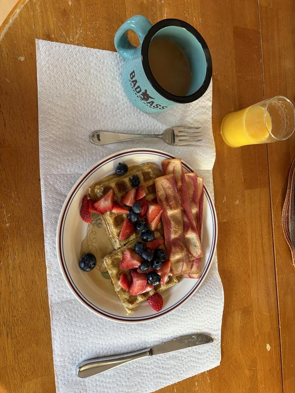 Just came in from Cuisinart this week and made our first batch. Used to buy Vanns multigrain frozen waffles but it became hard to find them. Stores would sell out quickly or just never stocked them so we decided to make our own. Bought Reds multigrain mix, mixed in melted butter instead of oil and added the egg yolk plus folded in the beaten egg white. First batch a bit light at “3” but the next was much better at the “4” setting. No sticking, very easy to clean, made absolutely perfect waffles. Love this unit, it was just so easy to use.