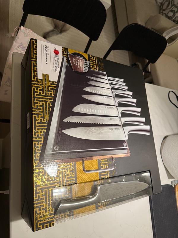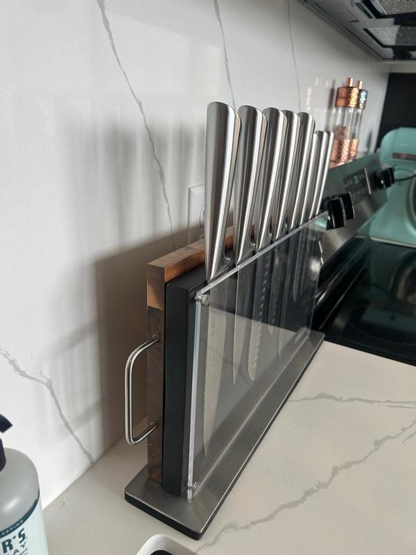 Beautiful knife set, they are really sharp and stay like that. Easy to clean and won’t get rusty at all. I like that it has recessed edges because it makes slices to be thin. This comes in a stylish block with removable wood cutting board. This are premium quality and are built to last.
