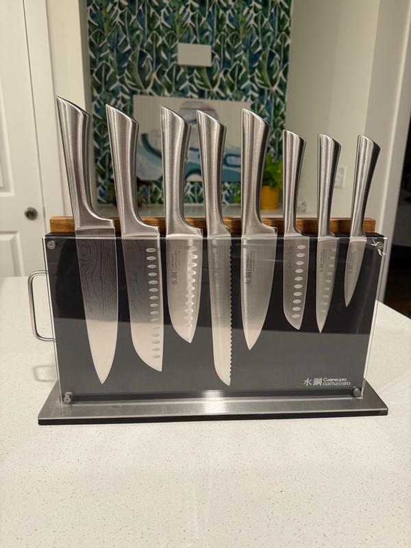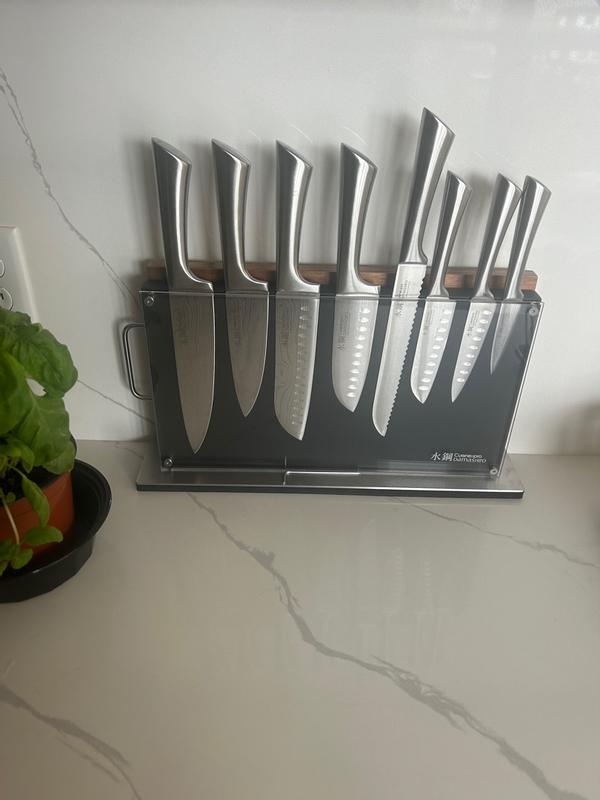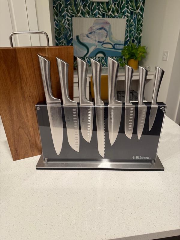 The knife set came with to pieces, a cutting board, magnetic knife holder and eight knives. The knife’s are sharp and the board is strong. I like that the knives are all metal and don’t have a plastic for the handle. The whole set is very pretty and I love how it looks on my kitchen counter top.