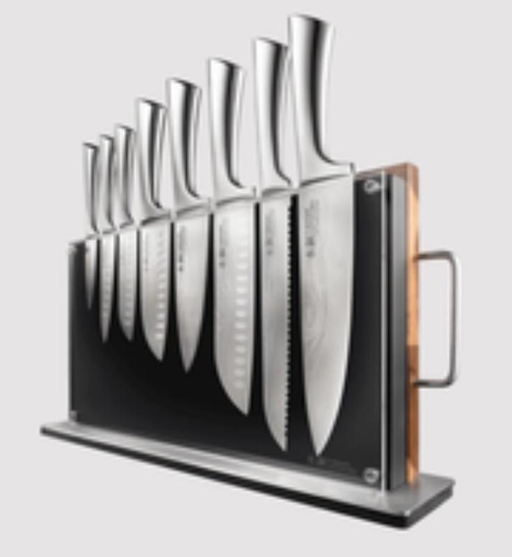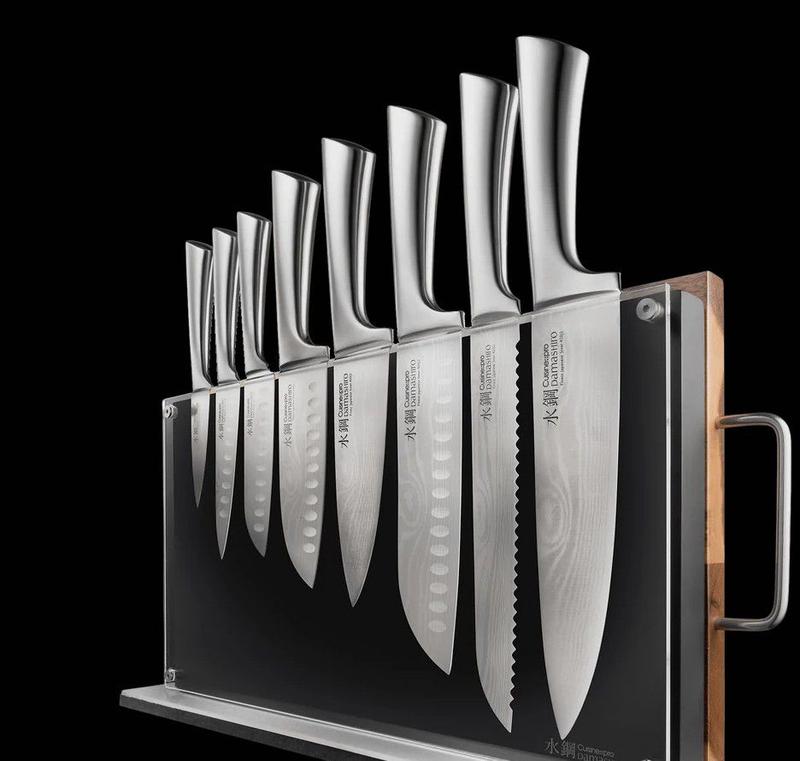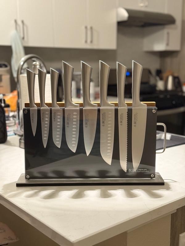 The knife has an impressive look and feel right out of box. This knife excels in sharpness. It is so comfortable for using. It is so many sizes for your cooking .