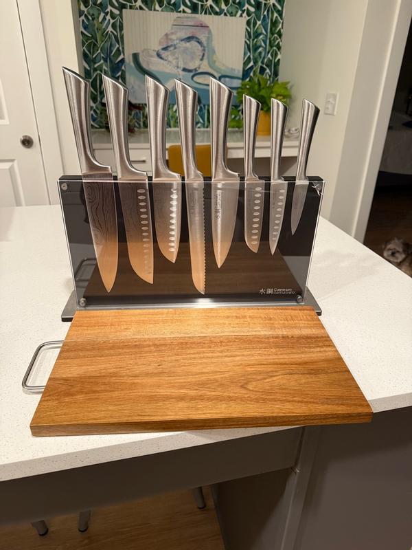 I love this knife set with the cut board. The knifes are sharp and strong. They have a great magnetic hold on the board. Everything is easy to clean by hand and the dishwasher.