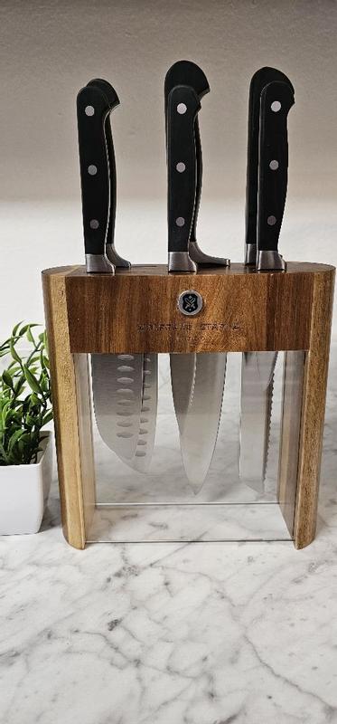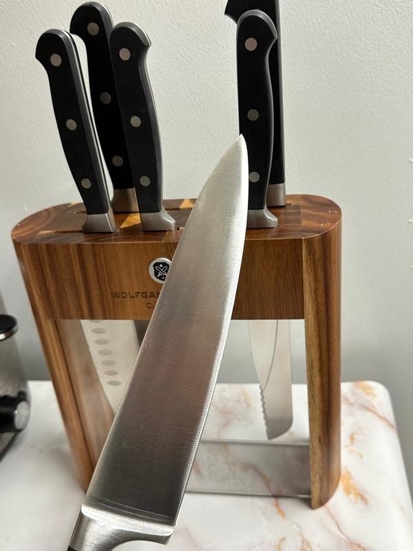 The Wolfgang Puck Cuisine Pro Knife Set is a good option for those looking for a versatile, budget-friendly knife set with solid performance. It includes a variety of knives like a chef’s knife, paring knife, utility knife, serrated knife, and sometimes a santoku knife, along with kitchen shears and sharpening steel. a good value for casual home cooks looking for an affordable, all-purpose knife set. It’s a solid choice for those who need a functional set without spending on premium brands. However, for professional or frequent cooks, an upgrade might be preferable for better edge retention and lighter handling.