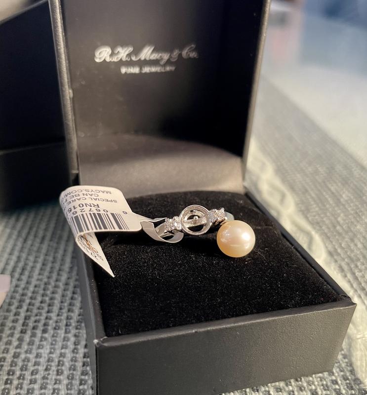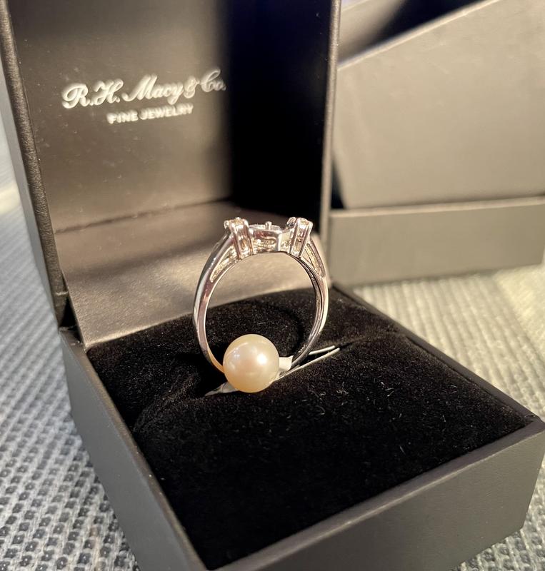 My husband bought this for me as a 55th wedding anniversary gift while we were in New York City. I had to have it resized since Macys sells their rings in size 7. I love it so much and the diamonds really sparkle. All pearls require extra care, so I will not wear it every day.
