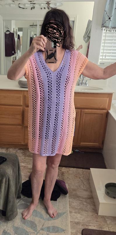 I purchased a medium, it’s pretty roomy so nice for putting over swimsuits that aren’t bikinis. The color isn’t as bright as pictured. It’s a very airy light dress as it is all crochet.