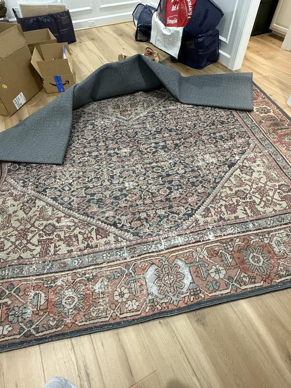 The rug is a vibrant red online but I reviewed a full bluish rug. Color is not as pictured.