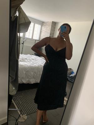 This dress is perfect! Definitely recommend sizing down. The button detail on the front is so cute. The tie on the straps is a nice little detail for the look, but also really helps give a lot of support if you wanted it to. It just looks so nice and is so comfortable.