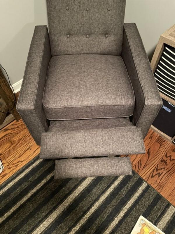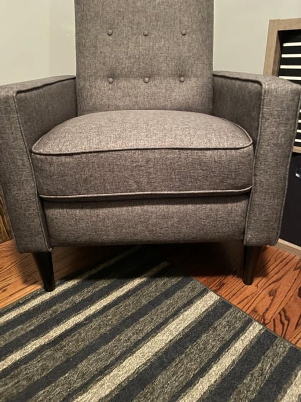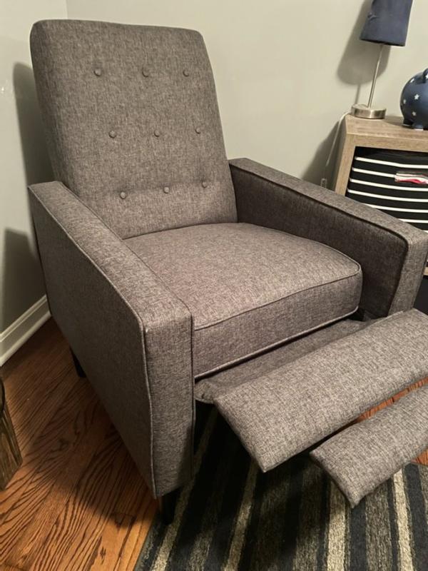 This is the first recliner I’ve owned and I quite like it. It’s a great addition to a living room but I like it in my bedroom to have a comfortable space to sit or read. I like the look and style of this recliner which is much more compact compared to traditional oversized recliners. The material is soft and comfortable to sit on and feels durable. If you have a smaller space but want the comfort of a recliner, this is a reasonable option. Instead of a lever to recline the chair, you push against the back and the recliner portion extends. I actually would have preferred a lever or button to do this as it’s a bit hard for me to do the push back to extend.
